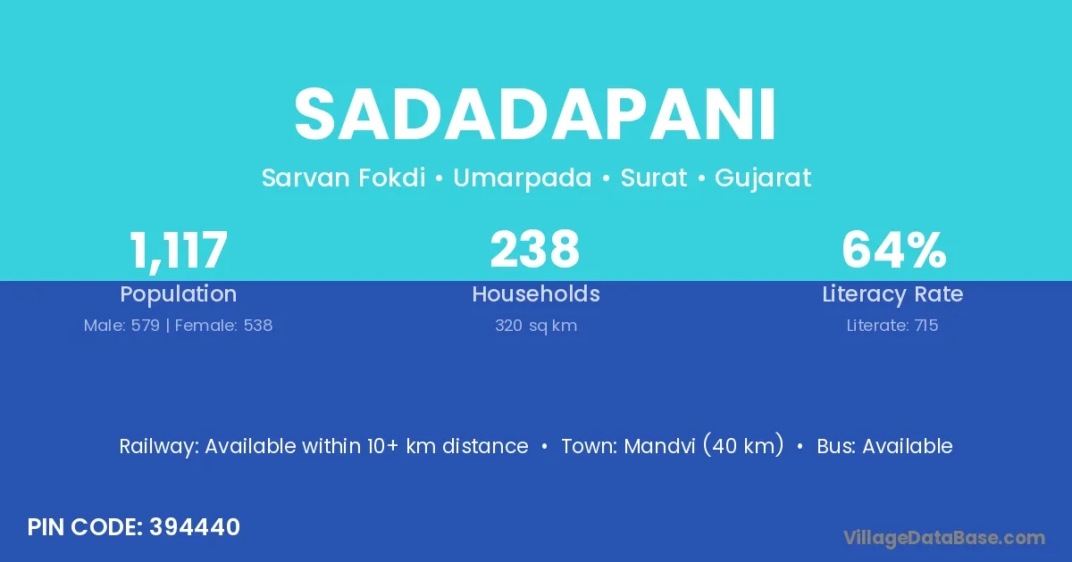 Mandvi (40 km) is the nearest town to Sadadapani village for major economic activities and is located approximately 40 km away.