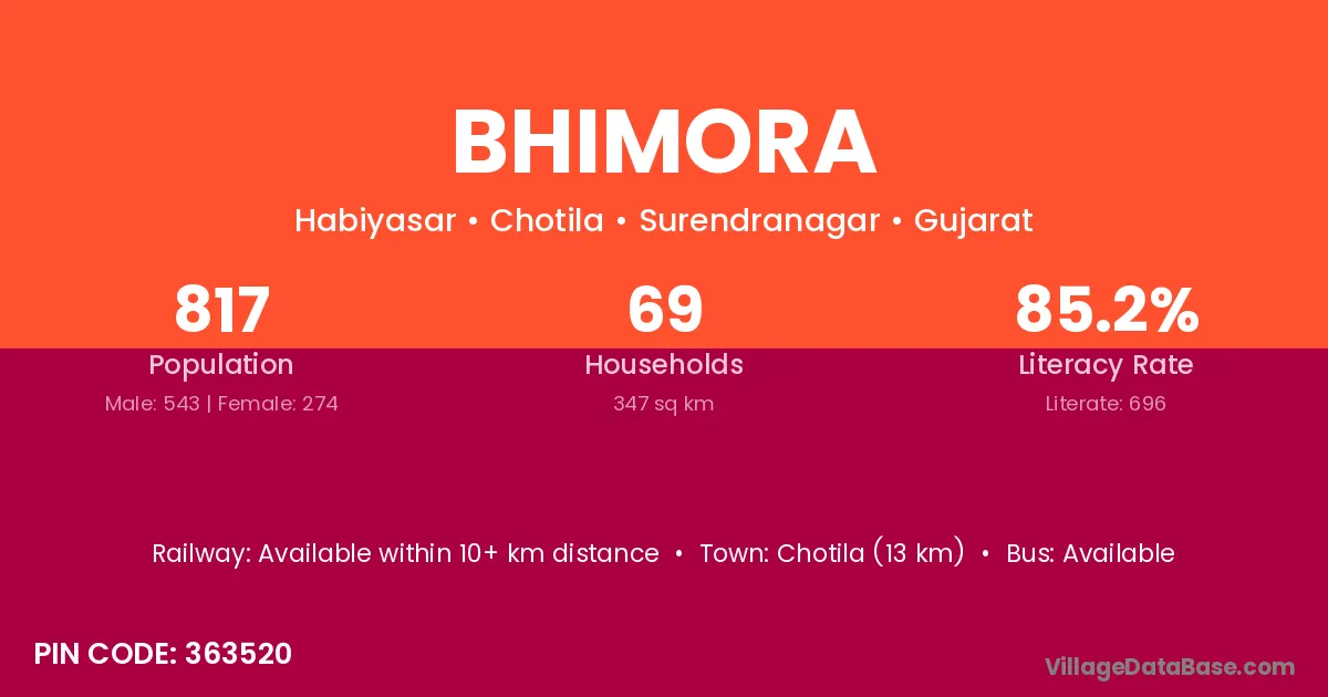 Chotila (13 km) is the nearest town to Bhimora village for major economic activities and is located approximately 13 km away.