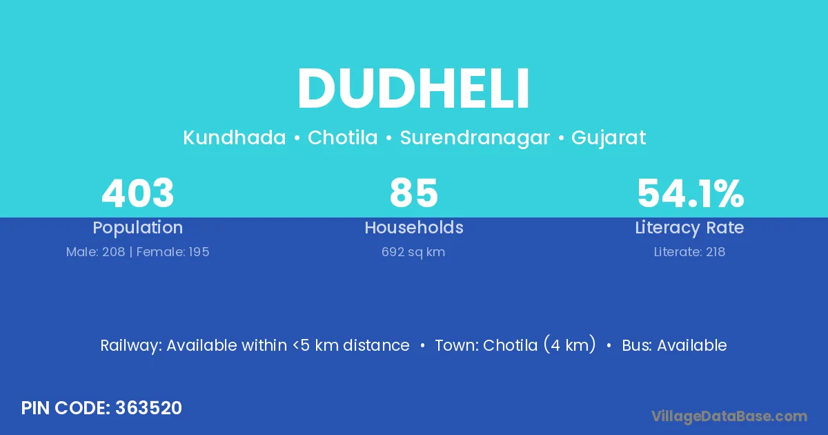 Chotila (4 km) is the nearest town to Dudheli village for major economic activities and is located approximately 4 km away.