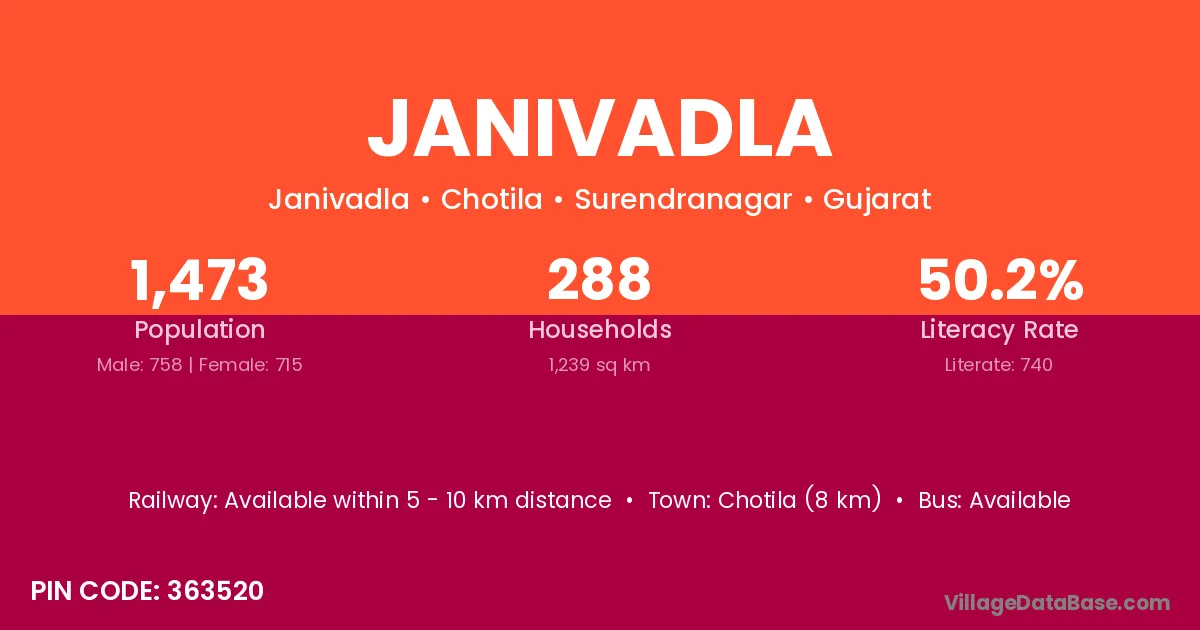 Chotila (8 km) is the nearest town to Janivadla village for major economic activities and is located approximately 8 km away.