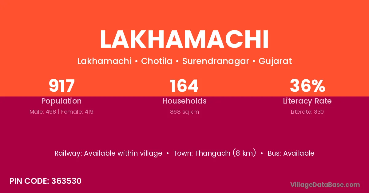Thangadh (8 km) is the nearest town to Lakhamachi village for major economic activities and is located approximately 8 km away.