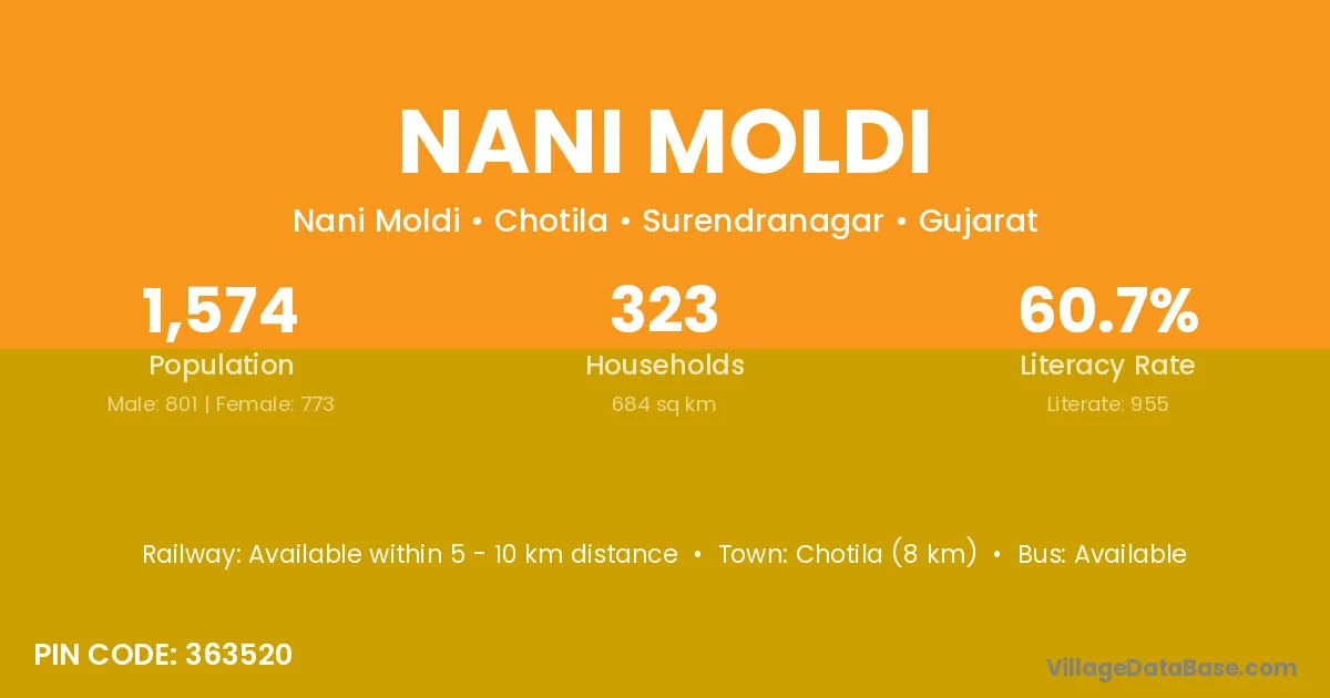 Chotila (8 km) is the nearest town to Nani Moldi village for major economic activities and is located approximately 8 km away.