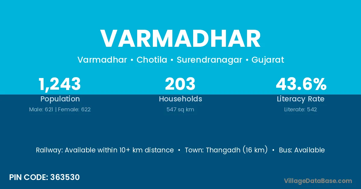 Thangadh (16 km) is the nearest town to Varmadhar village for major economic activities and is located approximately 16 km away.