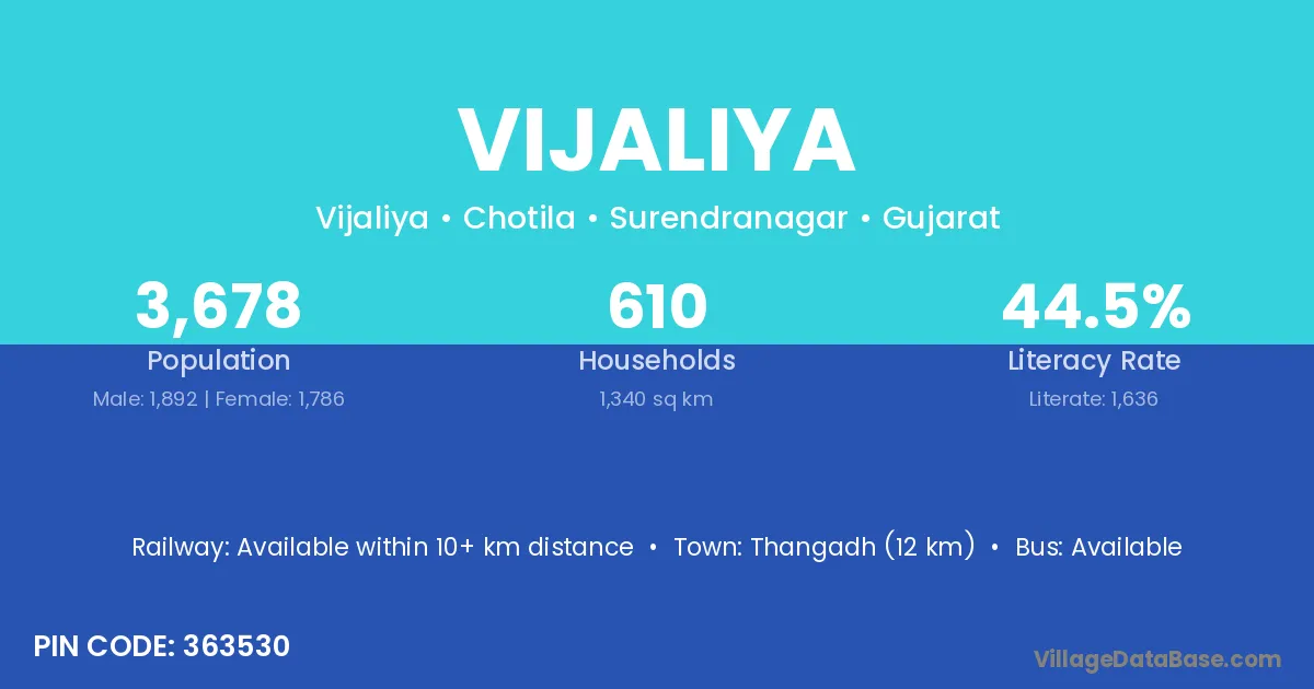 Thangadh (12 km) is the nearest town to Vijaliya village for major economic activities and is located approximately 12 km away.