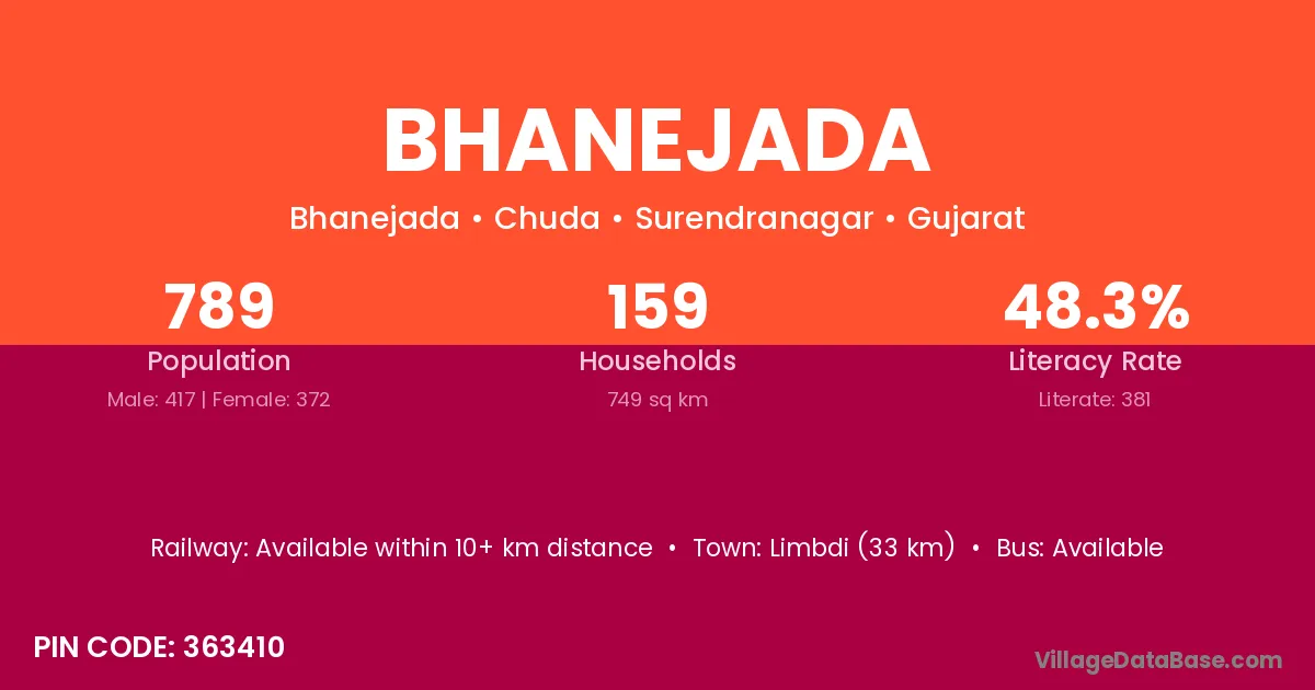 Limbdi (33 km) is the nearest town to Bhanejada village for major economic activities and is located approximately 33 km away.