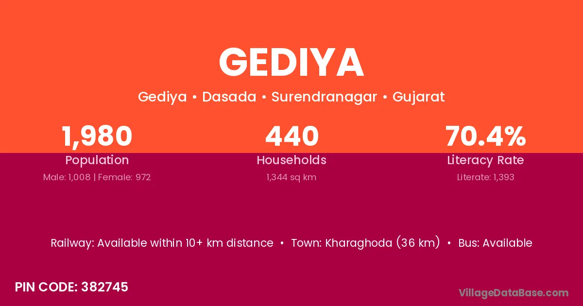 Kharaghoda (36 km) is the nearest town to Gediya village for major economic activities and is located approximately 36 km away.
