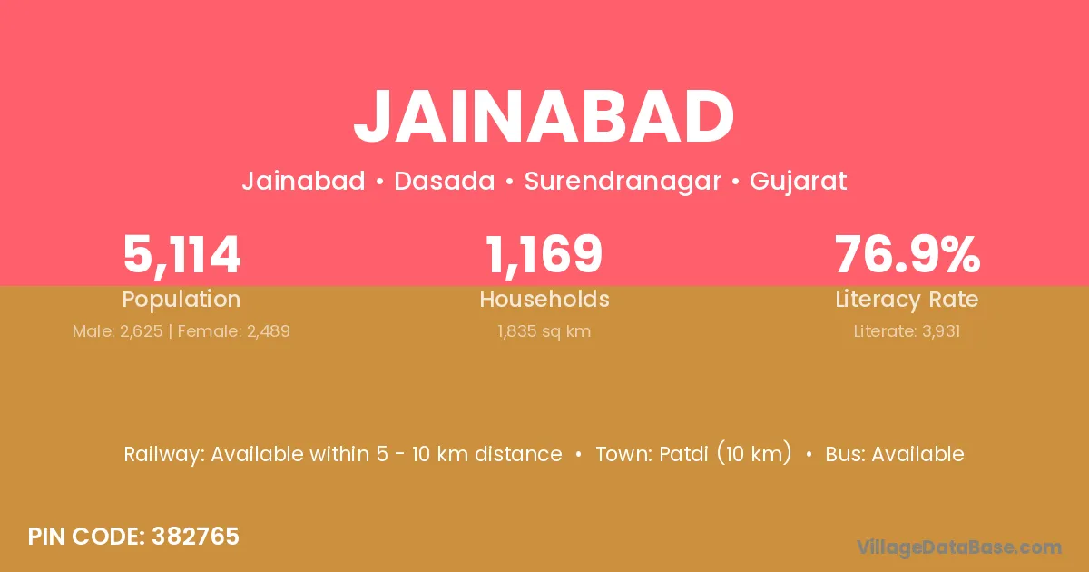 Patdi (10 km) is the nearest town to Jainabad village for major economic activities and is located approximately 10 km away.