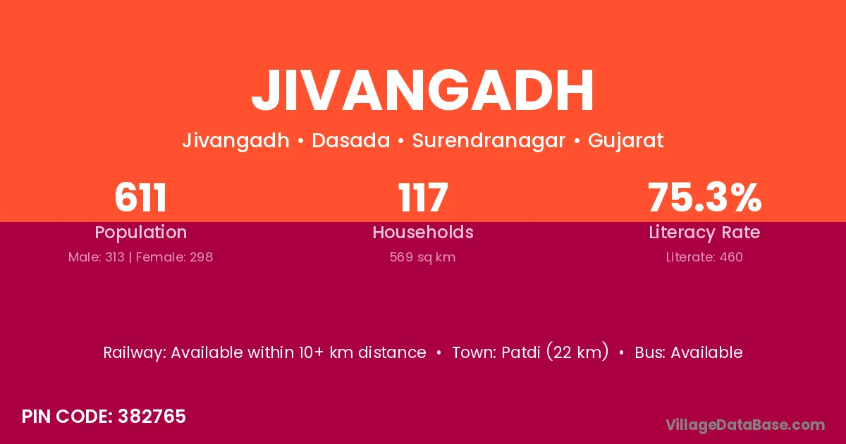 Patdi (22 km) is the nearest town to Jivangadh village for major economic activities and is located approximately 22 km away.