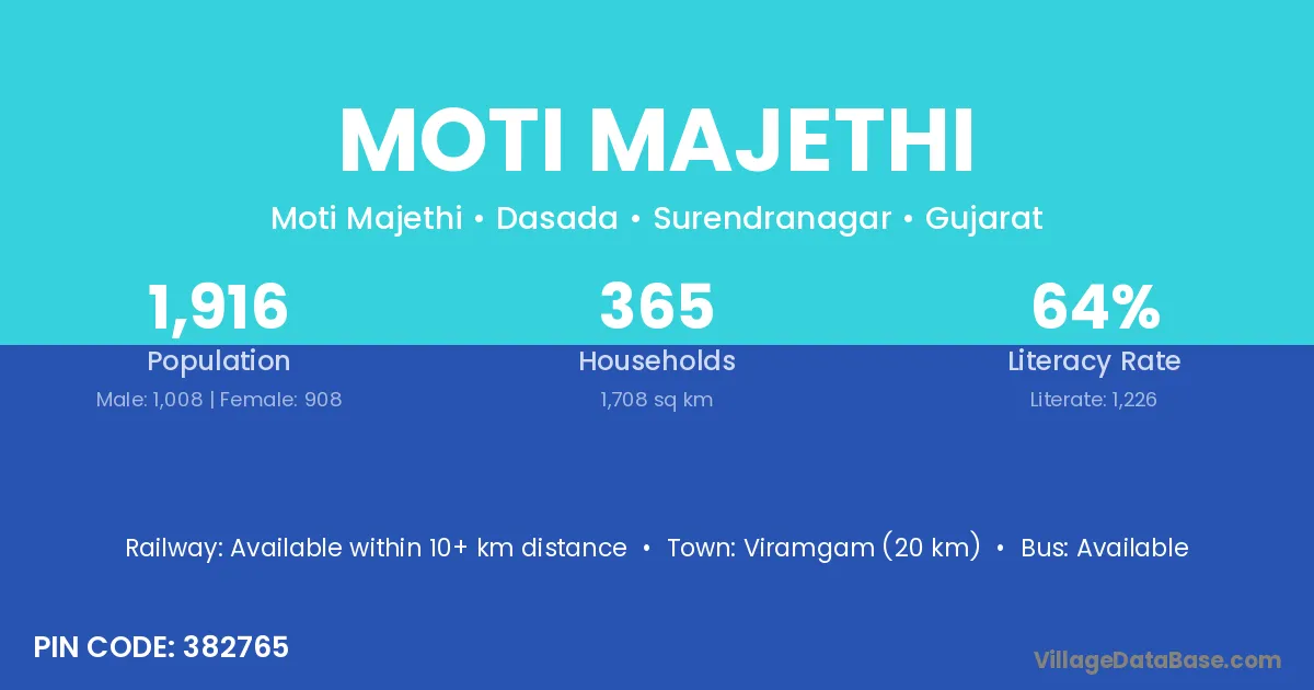 Viramgam (20 km) is the nearest town to Moti Majethi village for major economic activities and is located approximately 20 km away.
