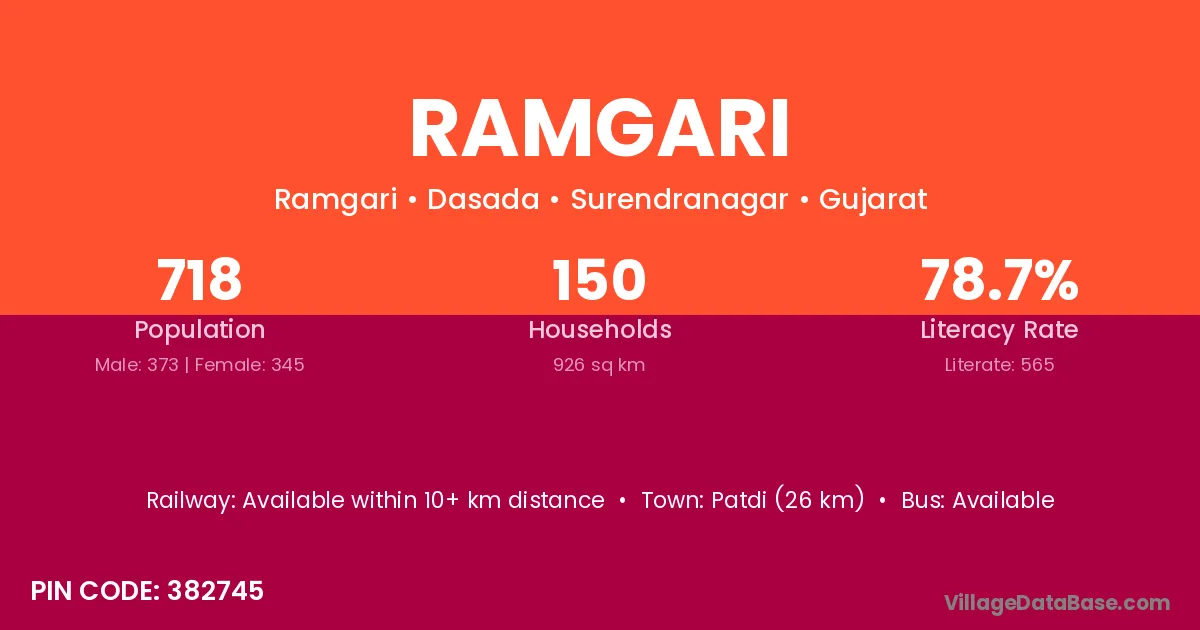 Patdi (26 km) is the nearest town to Ramgari village for major economic activities and is located approximately 26 km away.