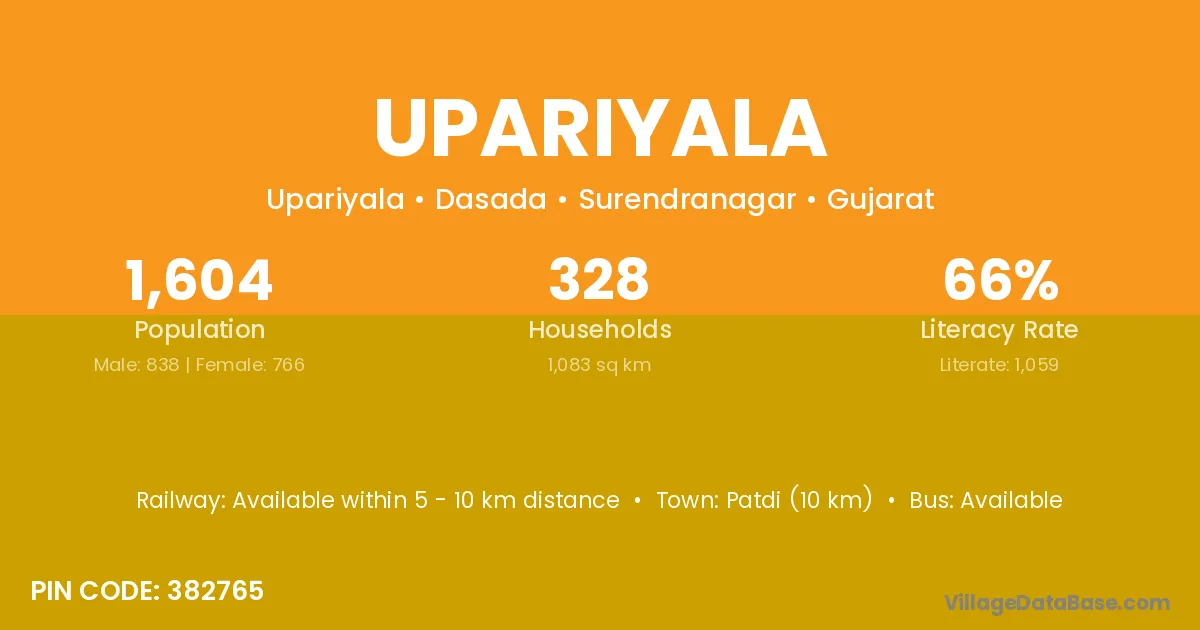 Patdi (10 km) is the nearest town to Upariyala village for major economic activities and is located approximately 10 km away.