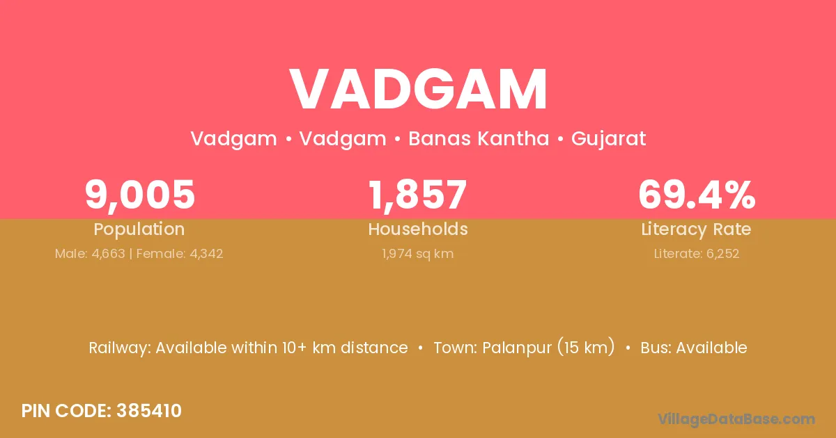 Patdi (2 km) is the nearest town to Vadgam village for major economic activities and is located approximately 2 km away.