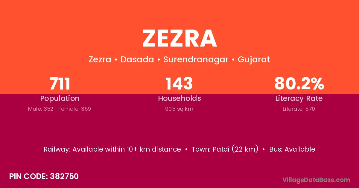 Patdi (22 km) is the nearest town to Zezra village for major economic activities and is located approximately 22 km away.