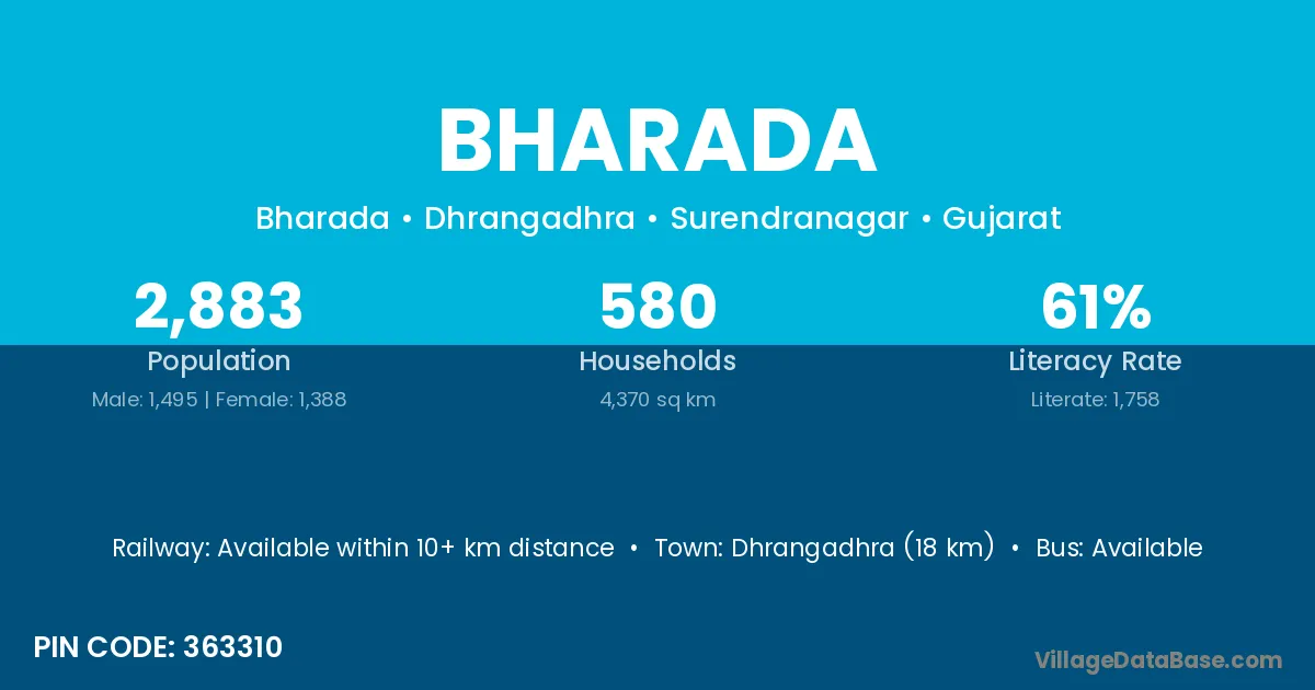 Dhrangadhra (18 km) is the nearest town to Bharada village for major economic activities and is located approximately 18 km away.
