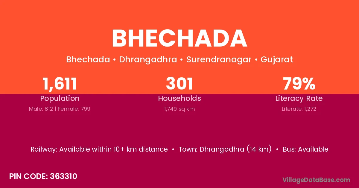 Dhrangadhra (14 km) is the nearest town to Bhechada village for major economic activities and is located approximately 14 km away.