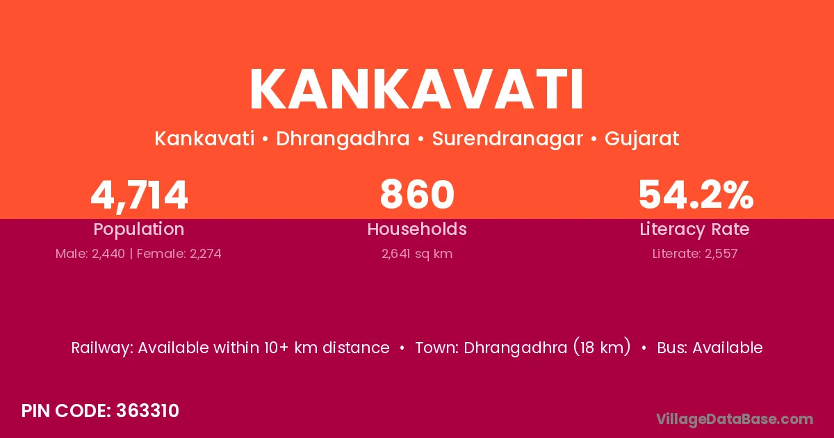 Dhrangadhra (18 km) is the nearest town to Kankavati village for major economic activities and is located approximately 18 km away.