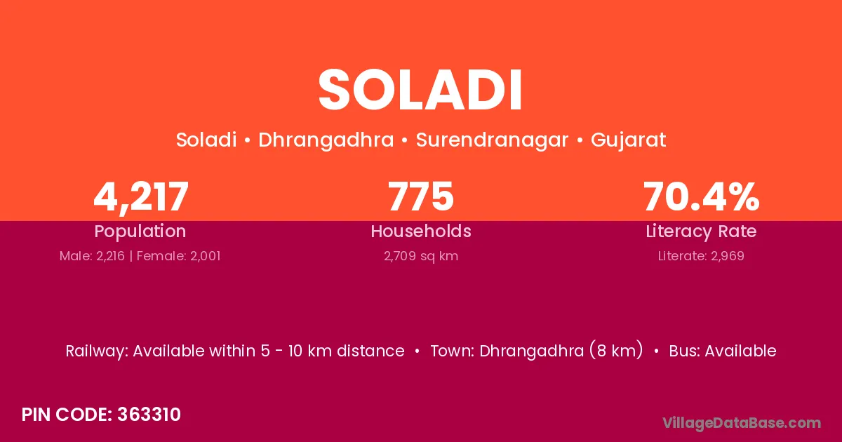 Dhrangadhra (8 km) is the nearest town to Soladi village for major economic activities and is located approximately 8 km away.