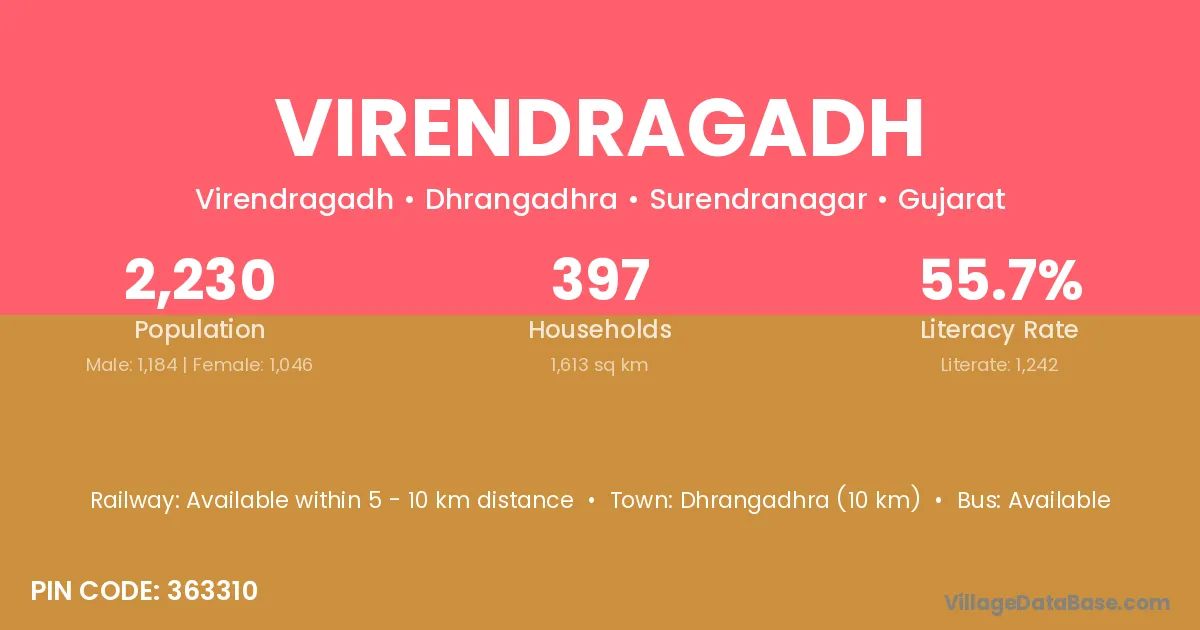 Dhrangadhra (10 km) is the nearest town to Virendragadh village for major economic activities and is located approximately 10 km away.