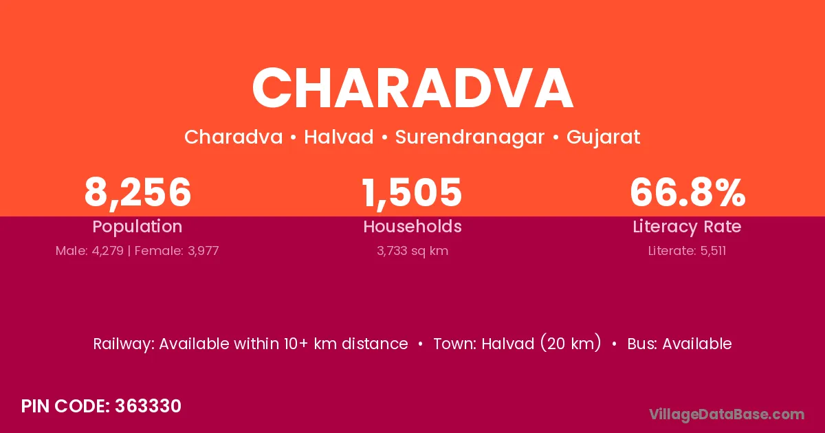 Halvad (20 km) is the nearest town to Charadva village for major economic activities and is located approximately 20 km away.