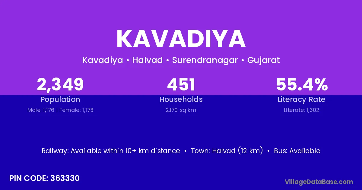 Halvad (12 km) is the nearest town to Kavadiya village for major economic activities and is located approximately 12 km away.