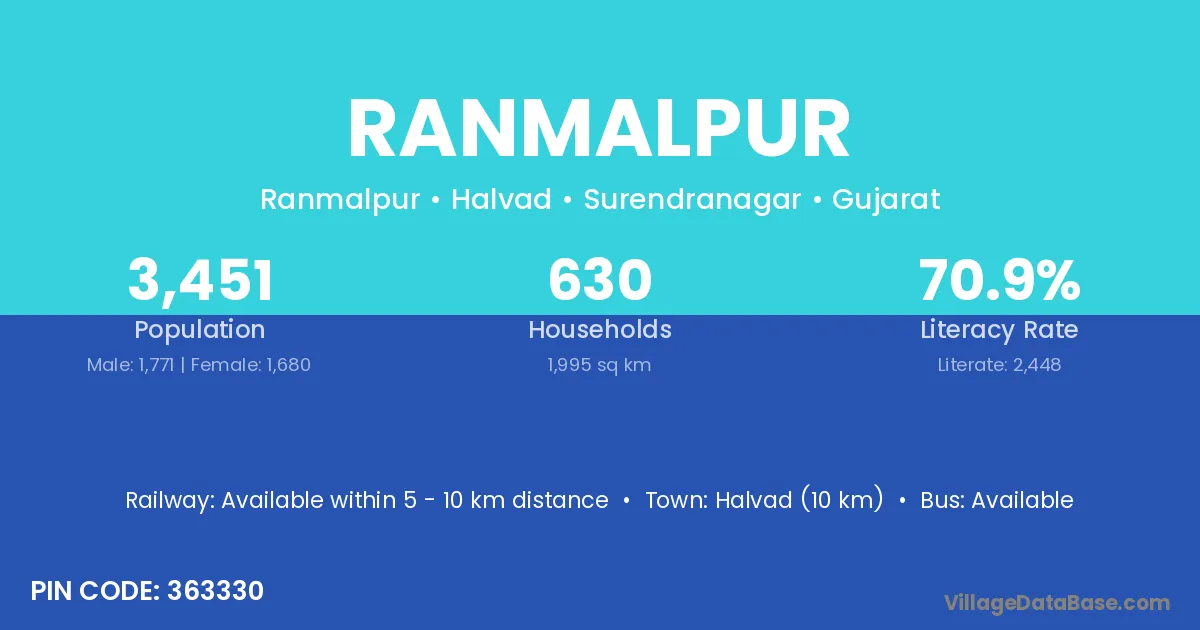 Halvad (10 km) is the nearest town to Ranmalpur village for major economic activities and is located approximately 10 km away.