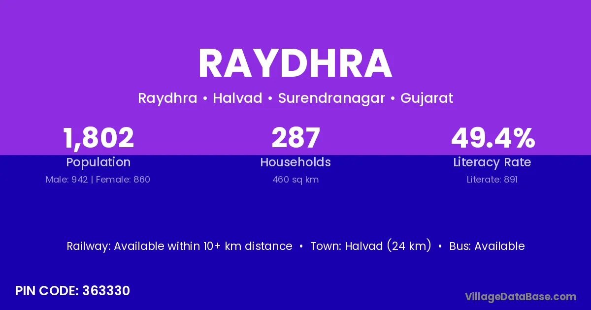 Halvad (24 km) is the nearest town to Raydhra village for major economic activities and is located approximately 24 km away.