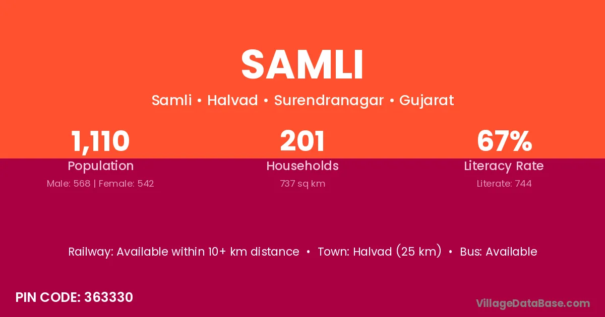 Halvad (25 km) is the nearest town to Samli village for major economic activities and is located approximately 25 km away.