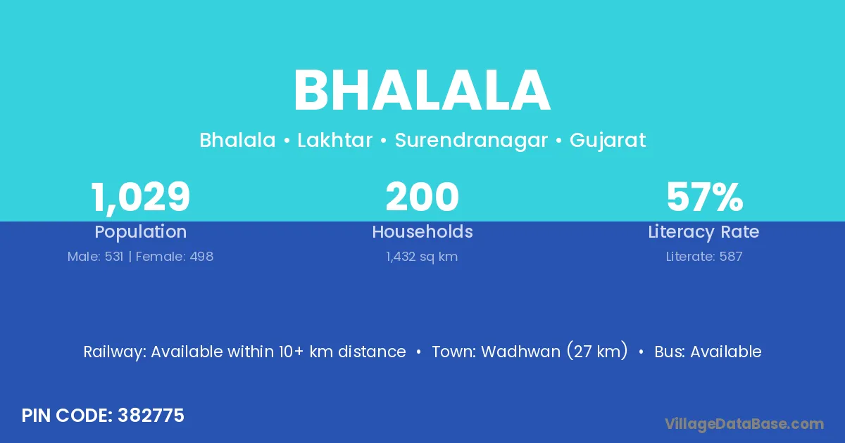 Wadhwan (27 km) is the nearest town to Bhalala village for major economic activities and is located approximately 27 km away.
