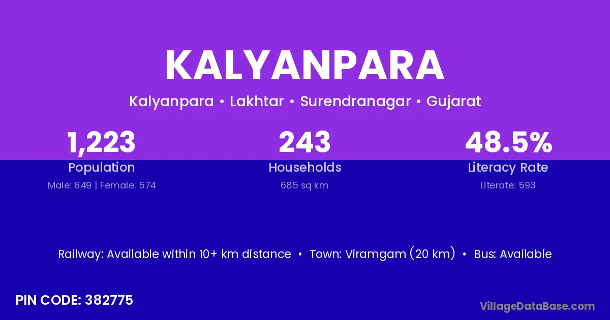Viramgam (20 km) is the nearest town to Kalyanpara village for major economic activities and is located approximately 20 km away.