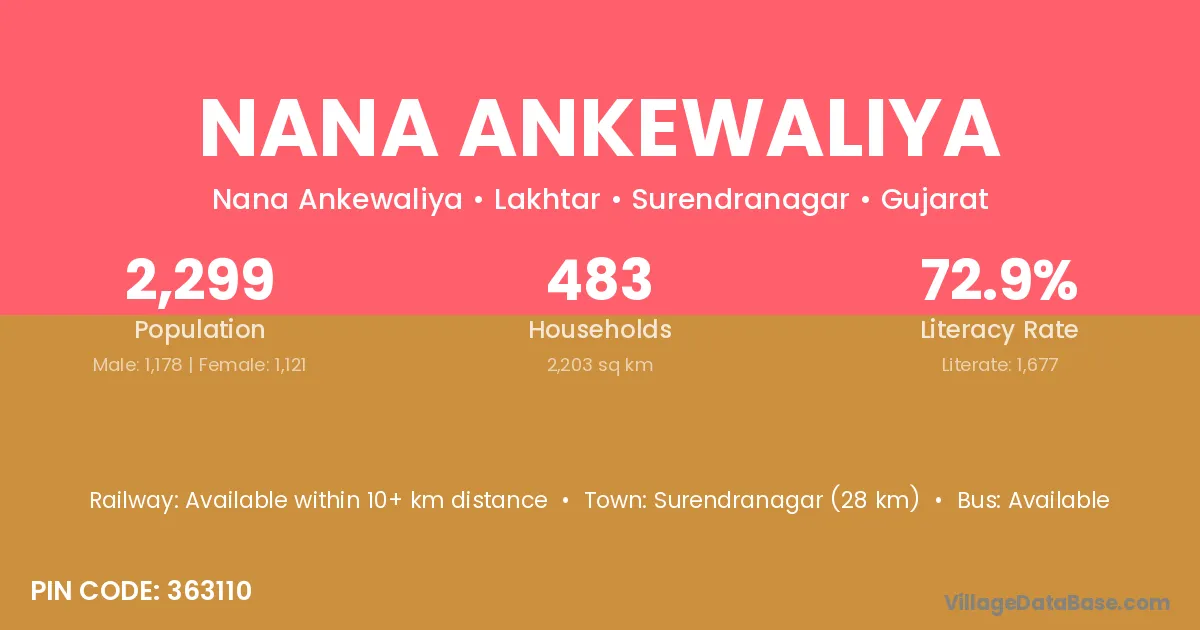 Surendranagar (28 km) is the nearest town to Nana Ankewaliya village for major economic activities and is located approximately 28 km away.