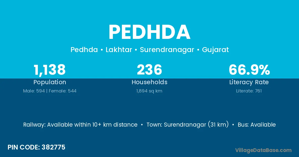 Surendranagar (31 km) is the nearest town to Pedhda village for major economic activities and is located approximately 31 km away.