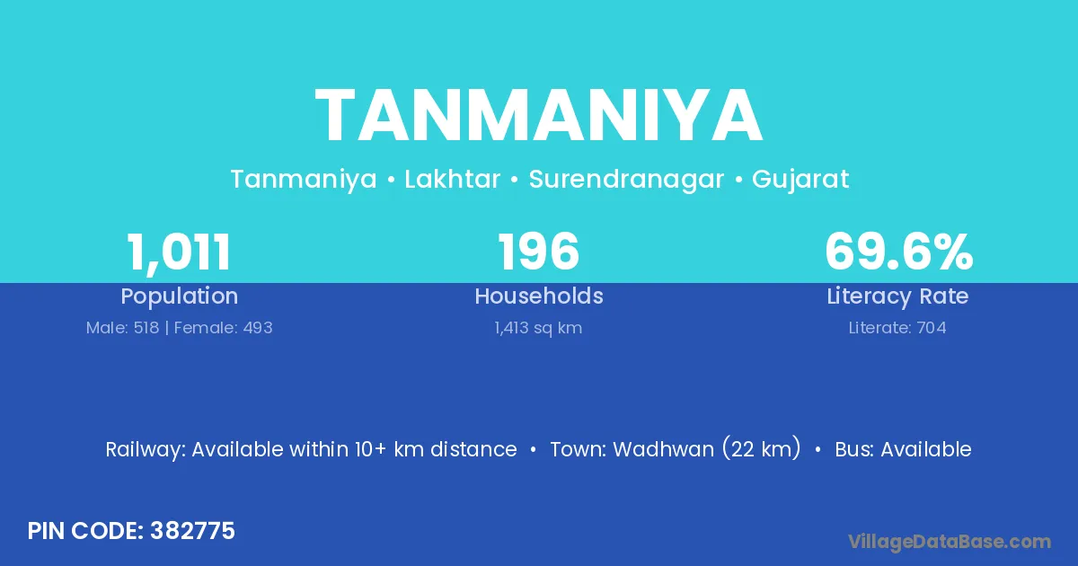 Wadhwan (22 km) is the nearest town to Tanmaniya village for major economic activities and is located approximately 22 km away.