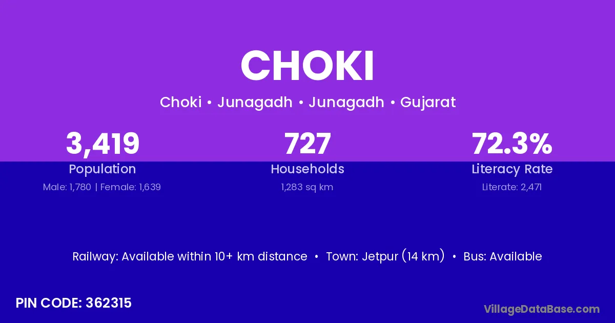 Limbdi (7 km) is the nearest town to Choki village for major economic activities and is located approximately 7 km away.