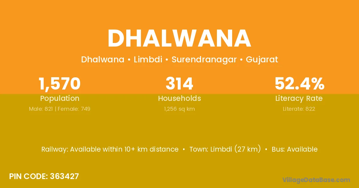 Limbdi (27 km) is the nearest town to Dhalwana village for major economic activities and is located approximately 27 km away.