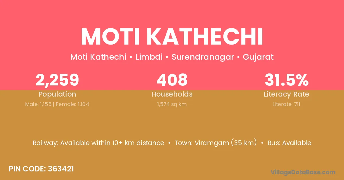 Viramgam (35 km) is the nearest town to Moti Kathechi village for major economic activities and is located approximately 35 km away.