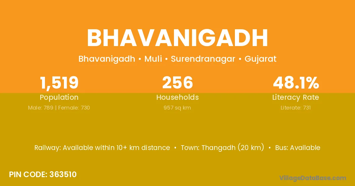 Thangadh (20 km) is the nearest town to Bhavanigadh village for major economic activities and is located approximately 20 km away.