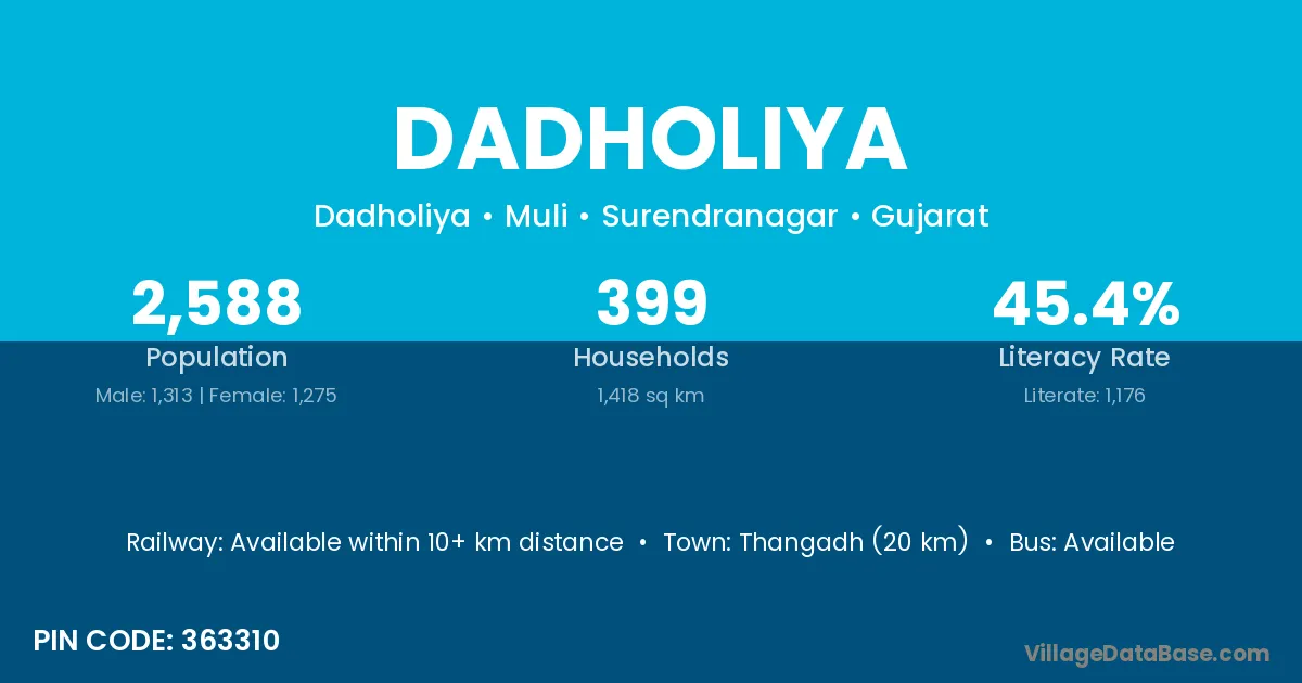 Thangadh (20 km) is the nearest town to Dadholiya village for major economic activities and is located approximately 20 km away.