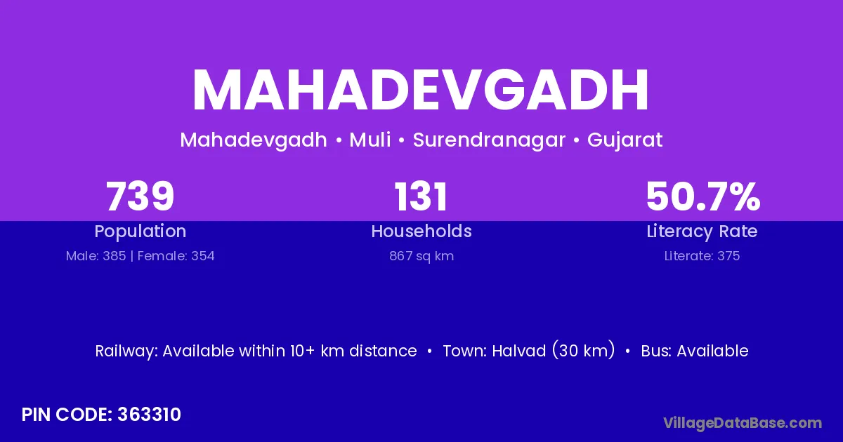 Halvad (30 km) is the nearest town to Mahadevgadh village for major economic activities and is located approximately 30 km away.