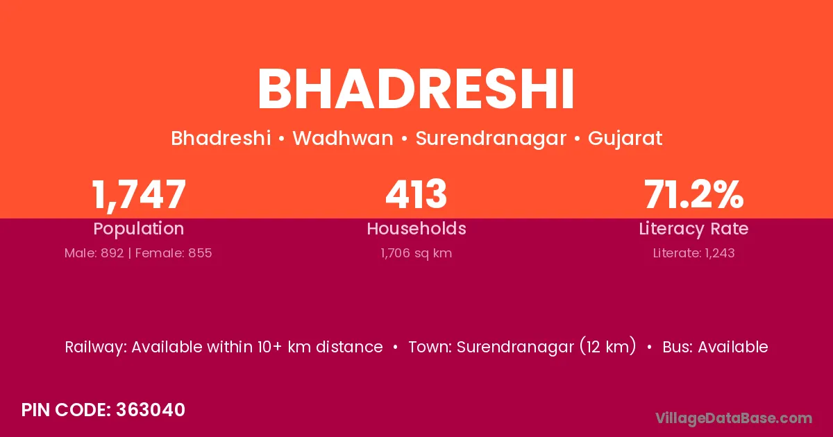 Surendranagar (12 km) is the nearest town to Bhadreshi village for major economic activities and is located approximately 12 km away.