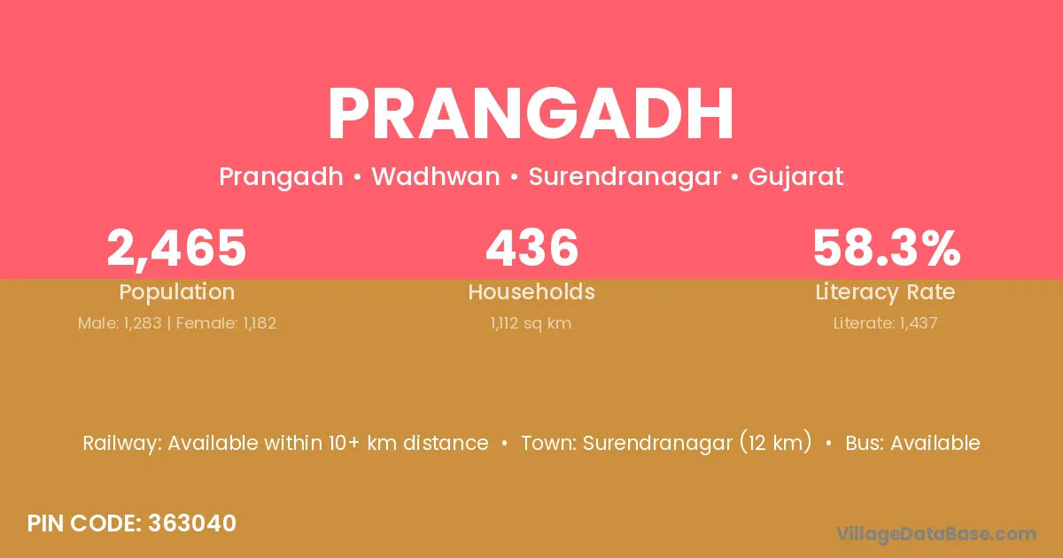 Surendranagar (12 km) is the nearest town to Prangadh village for major economic activities and is located approximately 12 km away.