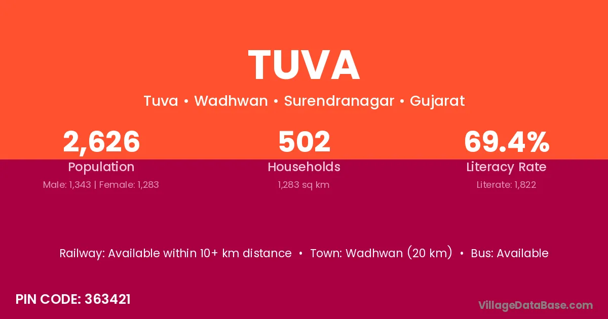 Wadhwan (20 km) is the nearest town to Tuva village for major economic activities and is located approximately 20 km away.