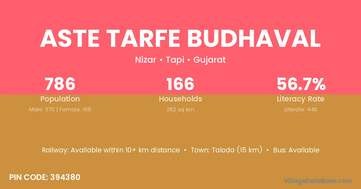 Taloda (15 km) is the nearest town to Aste Tarfe Budhaval village for major economic activities and is located approximately 15 km away.