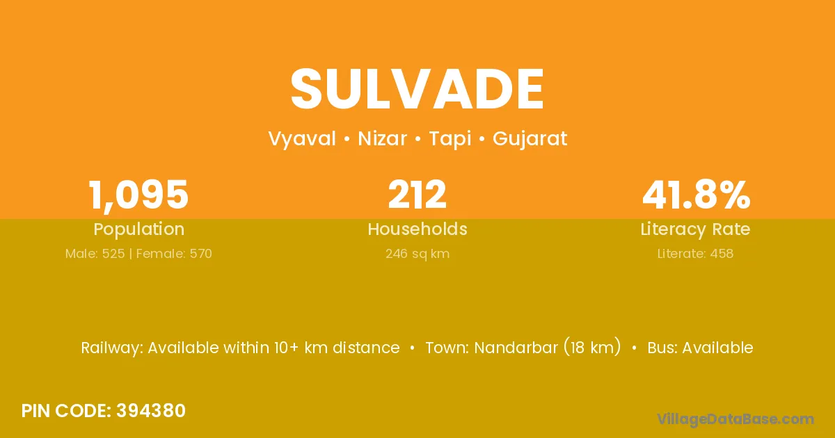 Nandarbar (18 km) is the nearest town to Sulvade village for major economic activities and is located approximately 18 km away.