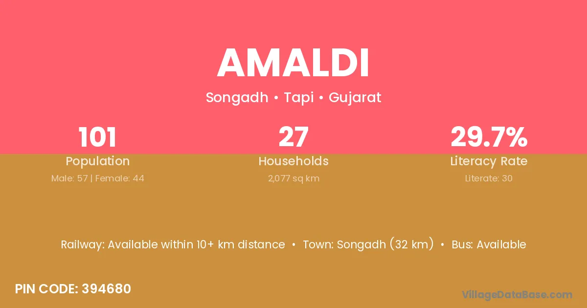 Songadh (32 km) is the nearest town to Amaldi village for major economic activities and is located approximately 32 km away.