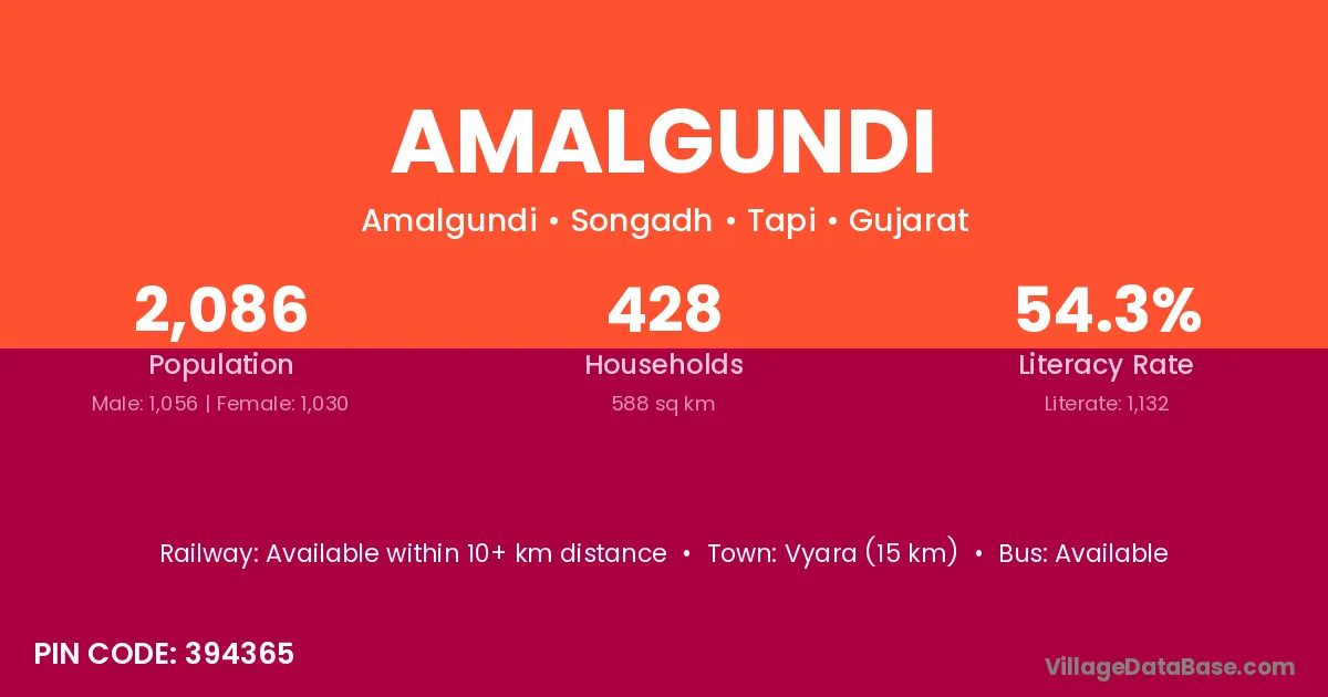 Vyara (15 km) is the nearest town to Amalgundi village for major economic activities and is located approximately 15 km away.