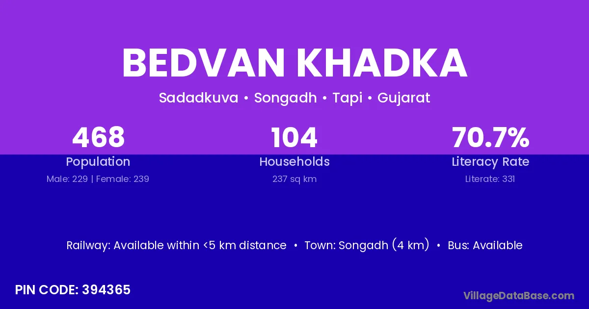 Songadh (4 km) is the nearest town to Bedvan Khadka village for major economic activities and is located approximately 4 km away.