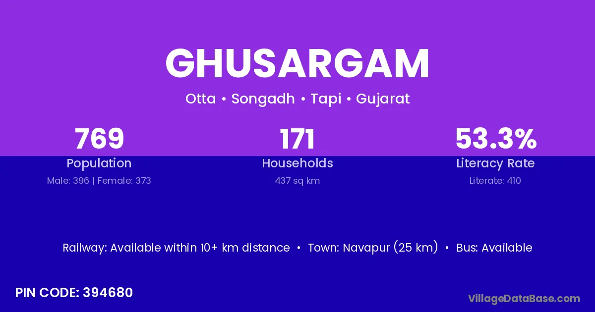 Navapur (25 km) is the nearest town to Ghusargam village for major economic activities and is located approximately 25 km away.