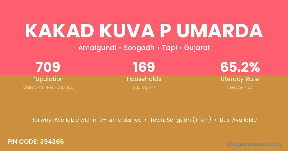 Songadh (11 km) is the nearest town to Kakad Kuva P Umarda village for major economic activities and is located approximately 11 km away.