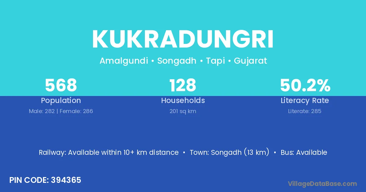 Songadh (13 km) is the nearest town to Kukradungri village for major economic activities and is located approximately 13 km away.