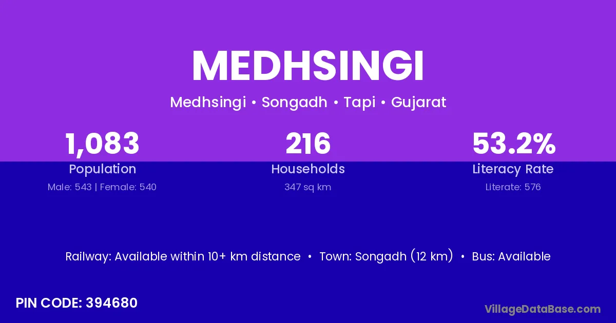 Songadh (12 km) is the nearest town to Medhsingi village for major economic activities and is located approximately 12 km away.